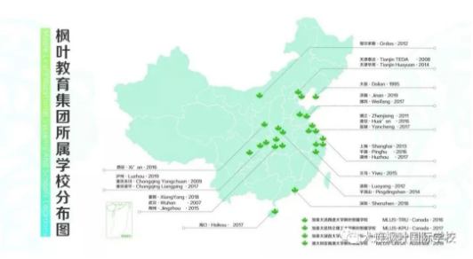 枫叶教育集团作为中国基础教育领域的国际教育领军者,1995年在大连首创枫叶国际学校,后于武汉、天津、重庆、镇江、洛阳、鄂尔多斯、上海、平顶山、义乌、荆州、西安、淮安、平湖、湖州、潍坊、盐城、海口、深圳、襄阳、泸州、济南、加拿大温哥华、甘露市、桑德贝和澳大利亚阿德莱德等地创办枫叶国际学校,目前在校生43500余人。