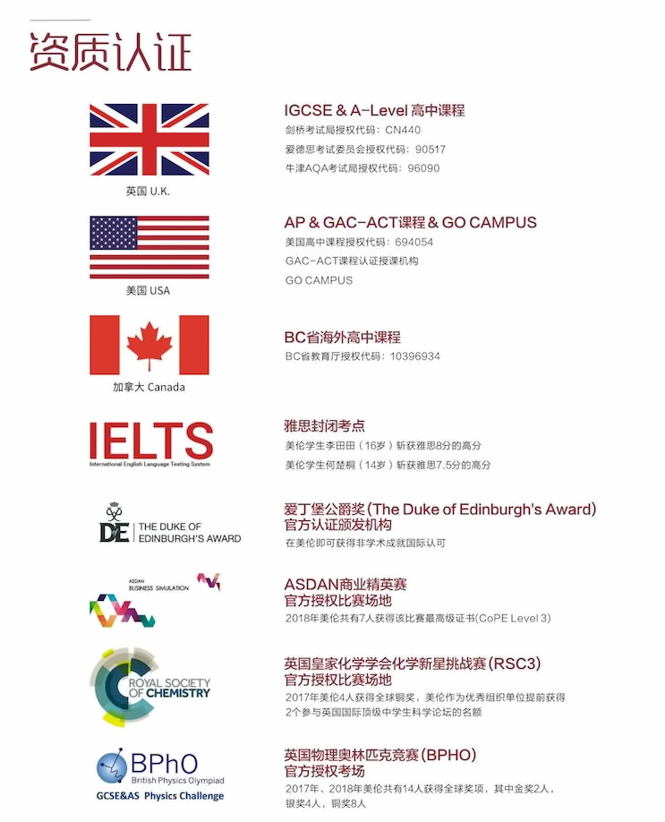 美伦国际教育(Majestic International College)是佛山市一所纯粹的国际高中课程学校,开设被誉为黄金课程体系等英国A-LEVEL&IGCSE高中课程、加拿大BC省离岸高中课程、美国AP课程和美国高中文凭课程。秉承“美于至善·伦谊国际”的校训和“乐学Cheerful、协同Cooperative、创新Creative、求真Challenging(简称“4C”)的育人理念,努力培养“有中国情怀、国际视野、适应未来、出得去回得来而且能够在世界上自由行走”的国际化人才,着力打造粤港澳大湾区**国际课程高中。