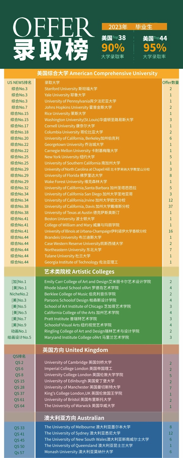 截至2024年5月,今年我校学生已获得82封TOP36OFFER,其中不乏斯坦福、耶鲁、霍普金斯等美国高等级院校!