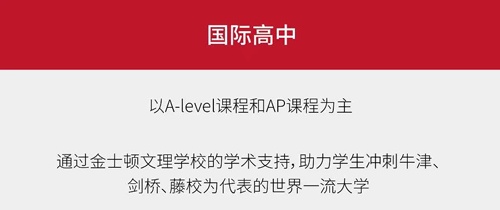 国际课程班以A-level课程为主,有机融合AP课程,并通过金士顿文理学校的学术支持,助力学生冲击牛津、剑桥、藤校为代表的世界**大学。