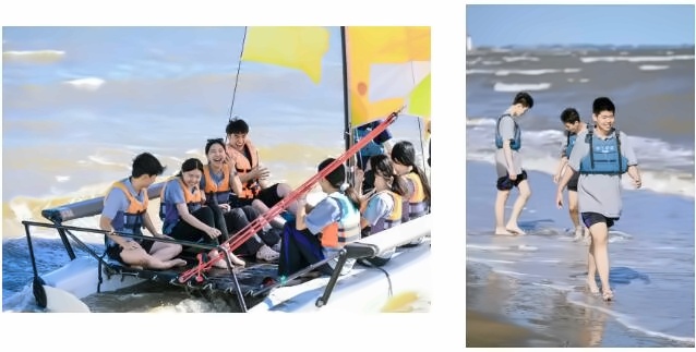 首先来到了帆船中心,迎接我们的是海风的轻抚,开始**个活动。在教练们的专业讲解和指导下,同学们从一个个青涩的少年,立刻摇身一变,开始在海上乘风破浪,孩子们享受着在海上驰骋畅快!
