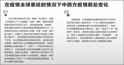 在英语老师的指导下,孩子们阅读并观看了许多中英文的宣传册、视频和新闻报道,他们认识到中西方思想观念不同、卫生习惯不同、人口密度不同、**首脑的观点不同等的差异,使得中国人在疫情爆发之初都相应**号召足不出户,人人佩戴口罩,西方人却不愿意带口罩。