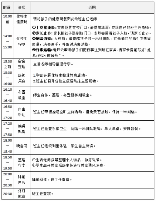 住校学生家长,请在孩子出门前帮助孩子确认校服(正装、运动装)、替换衣物是否备齐,并请检查床上用品、洗漱用品的准备。大件行李请贴上标签,注明班级、姓名。