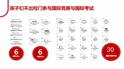 同时,学校拥有6个国际课程授权中心、6个国际国家考试中心、30项国际竞赛考点,这些学术展示平台,为每个孩子提供了展示自信的舞台,这是成长平台的定制;